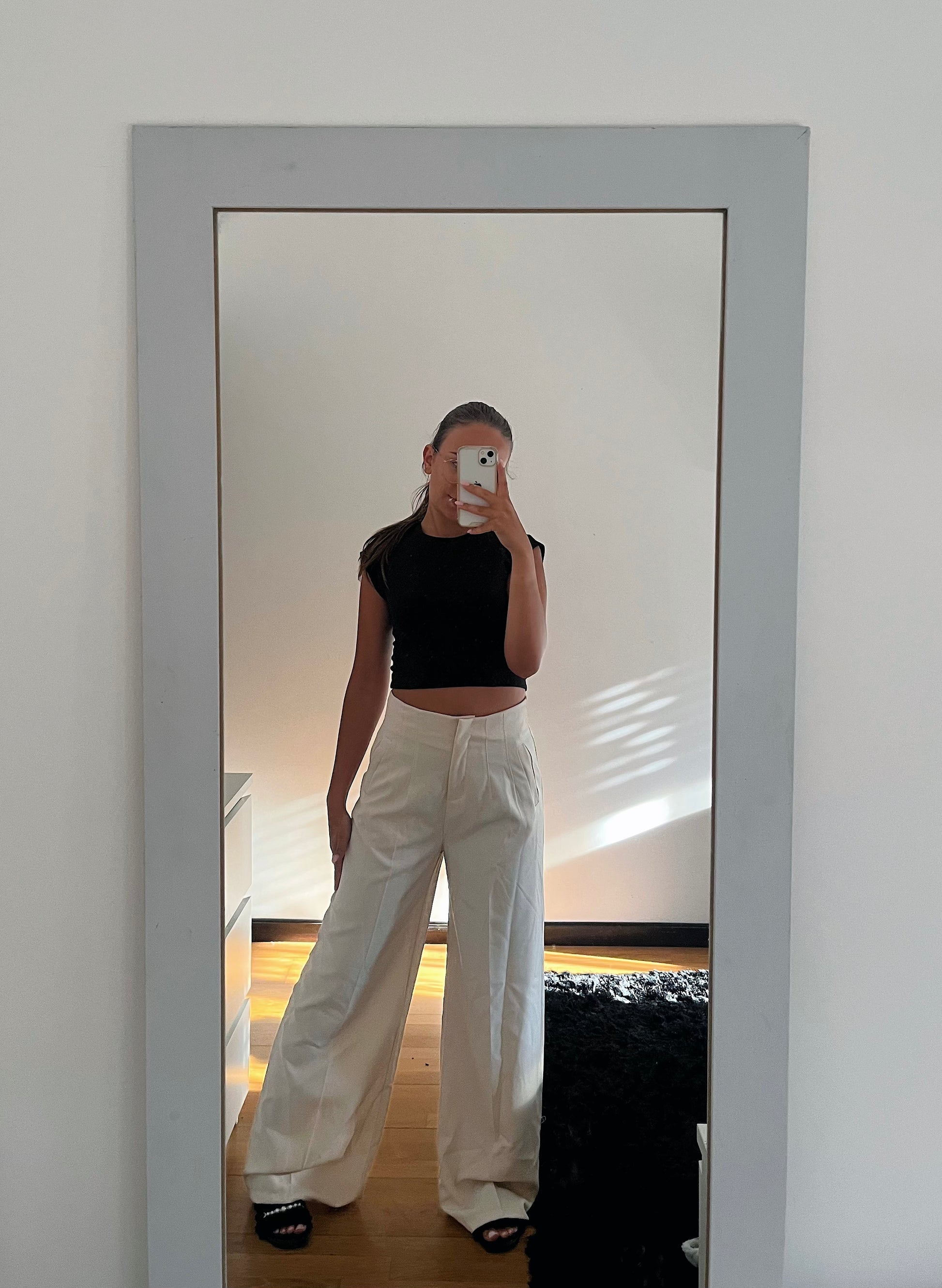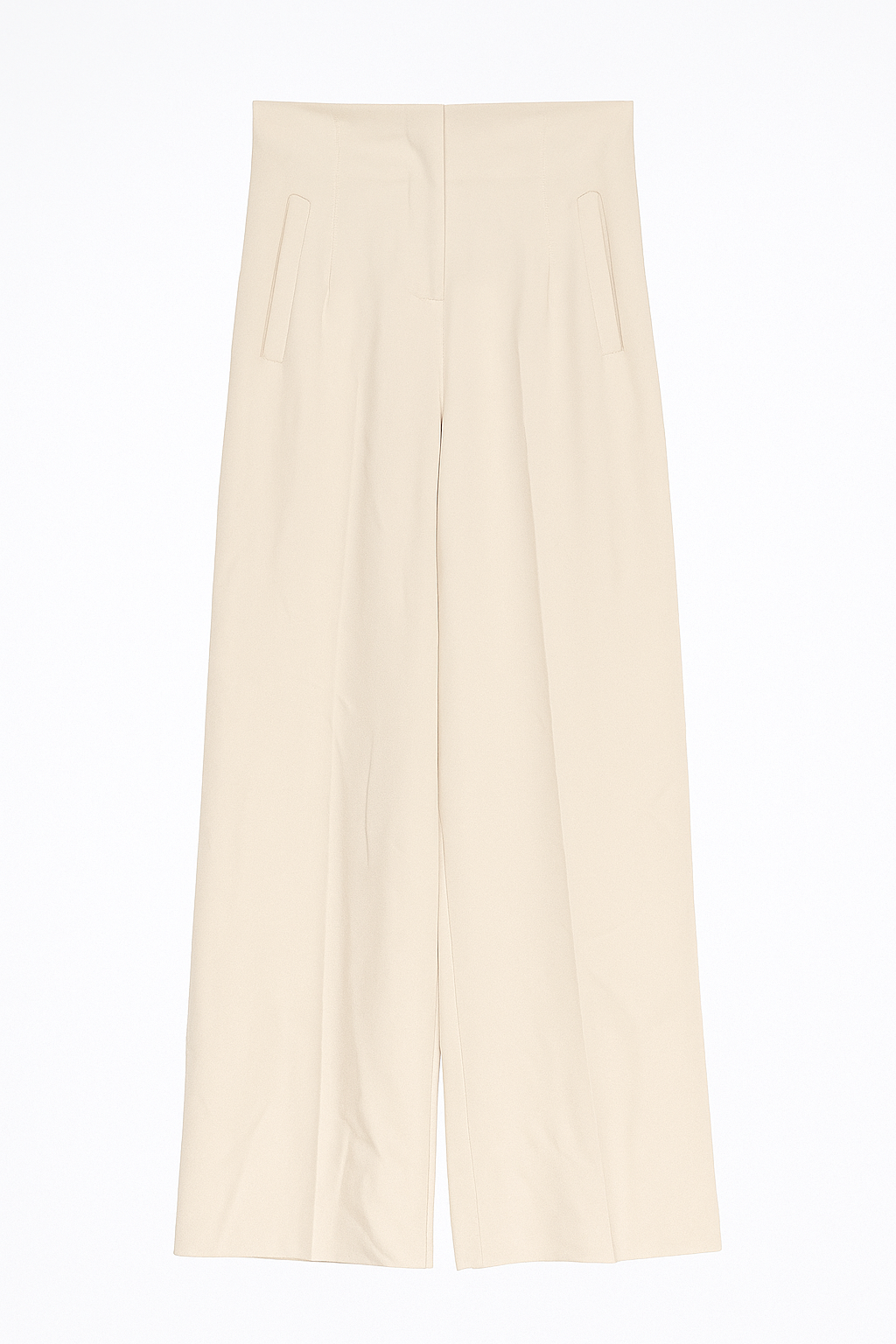 Calças de perna larga, com bolsos laterais e fecho frontal oculto.