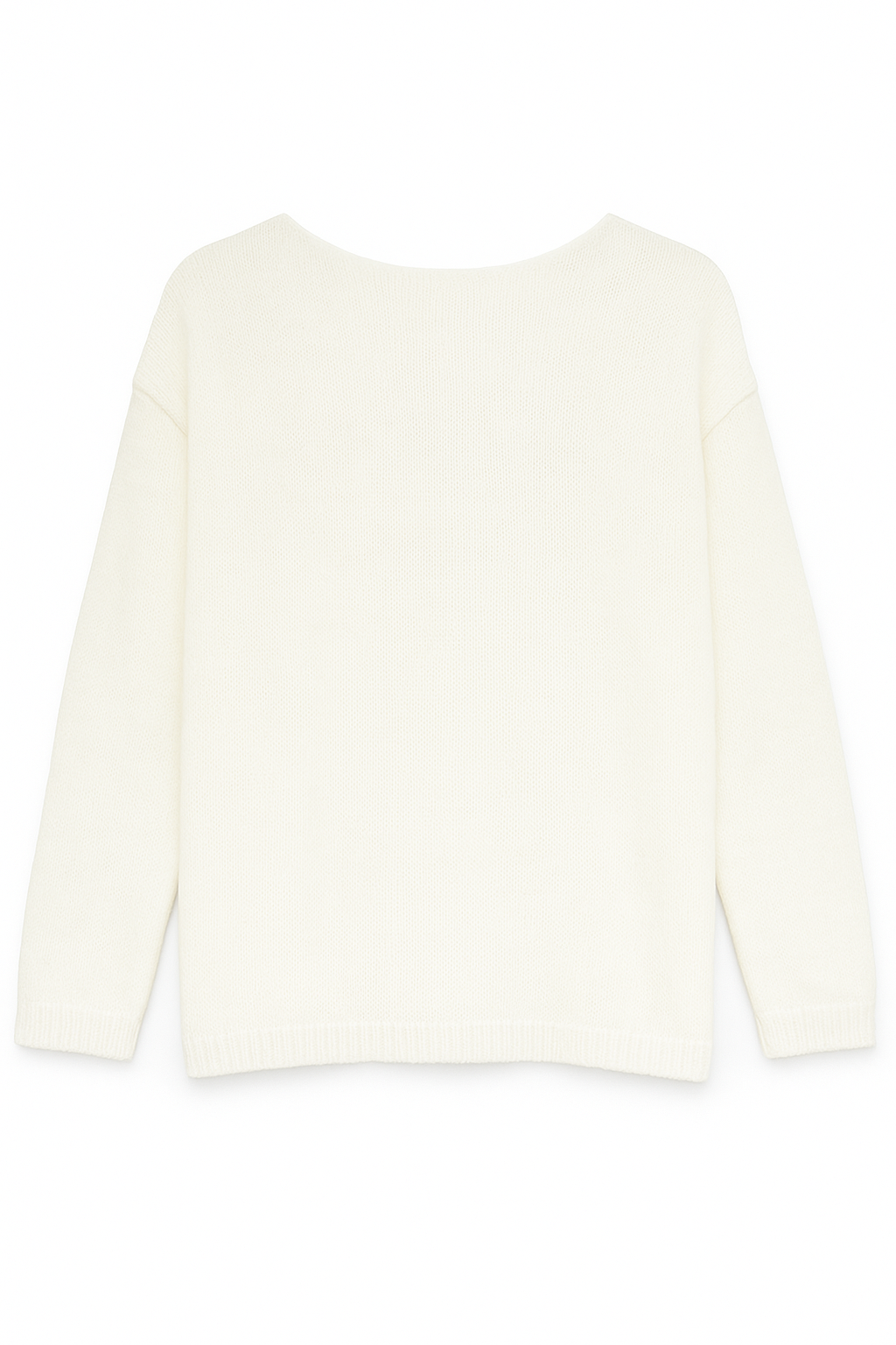 Camisola de malha de toque suave com decote arredondado e mangas compridas. Detalhe de laço aplicado nas costas. Corte reto e acabamento canelado na gola, punhos e bainha.