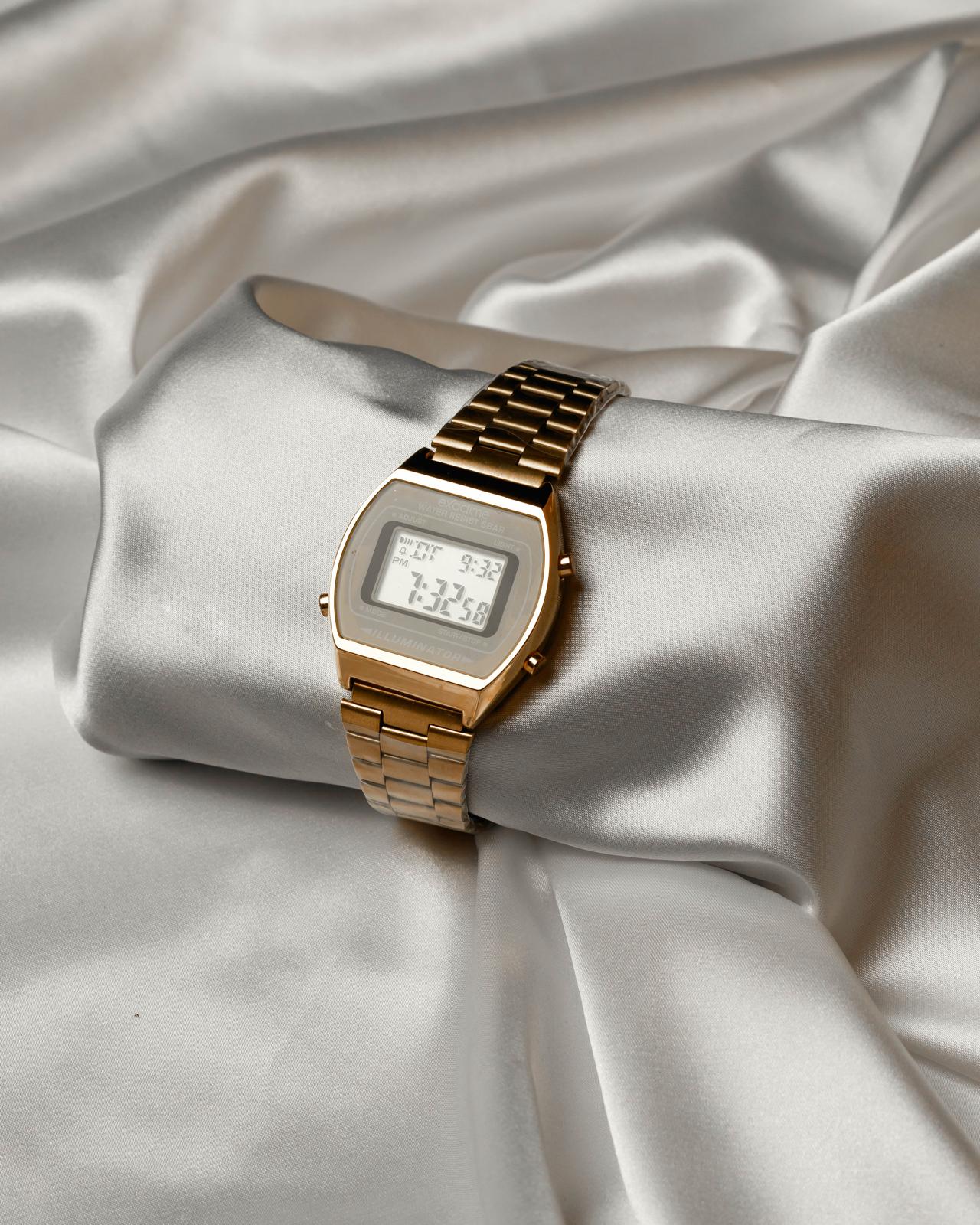 Relógio digital com design retro, em aço inoxidável. Possui funções de alarme, cronómetro e iluminação. Modelo com fecho ajustável.